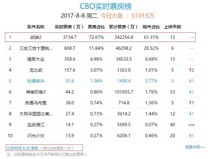 《战狼2》截止到昨天晚上已突破34亿大关,超越周星驰导演的《美人鱼》33.92亿,成为华语电影票房新纪录保持者,成功登顶,成为新的王者。眼下,《战狼2》仍在继续高歌猛进,上映第13天,票房继续领跑,截止到早上8:20左右,《战狼2》的实时票房为3734.7万,票房占比为72.67%,累计票房34.2亿,排片占比超60%,遥遥领先上映一周左右的《三生三世十里桃花》,而且近两周时间内,《战狼2》仍然没有遇到对手,继续霸榜。