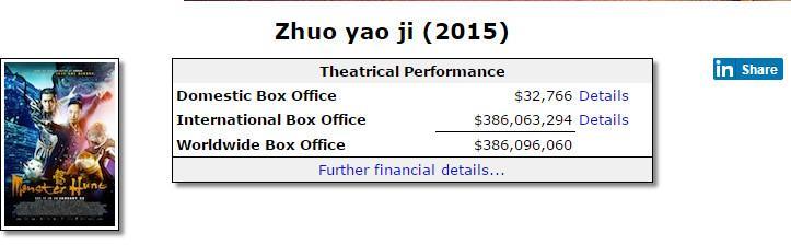 第三名《捉妖记》国内票房24.4亿,全球总票房为3.86亿美元,海外总票房为408.3万美元,约合2742万元。