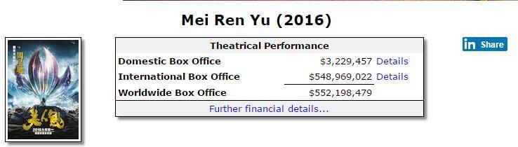 要知道在国产电影票房前三名中,排在第二的《美人鱼》海外票房为2443.9万美元,约合人民币1.6亿。