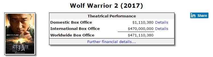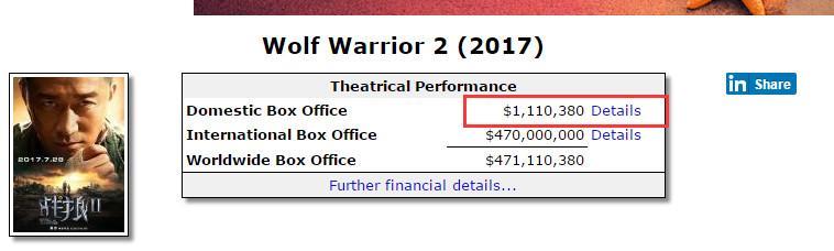 然而可喜的是,《战狼2》在海外市场并没有停住自己的脚步,根据一份数据显示,除了在美国票房破百万外,《战狼2》在澳大利亚的票房也破55万美元,而在总票房中,我们能够看到,除了国内截止到8月6日取得4.0592亿美元外,《战狼2》全球总票房达到4.7亿美元,而去除国内电影票房后,海外票房为6408万美元,约合人民币4.3亿,这样算下来,《战狼2》全球总票房超过38.5亿人民币。