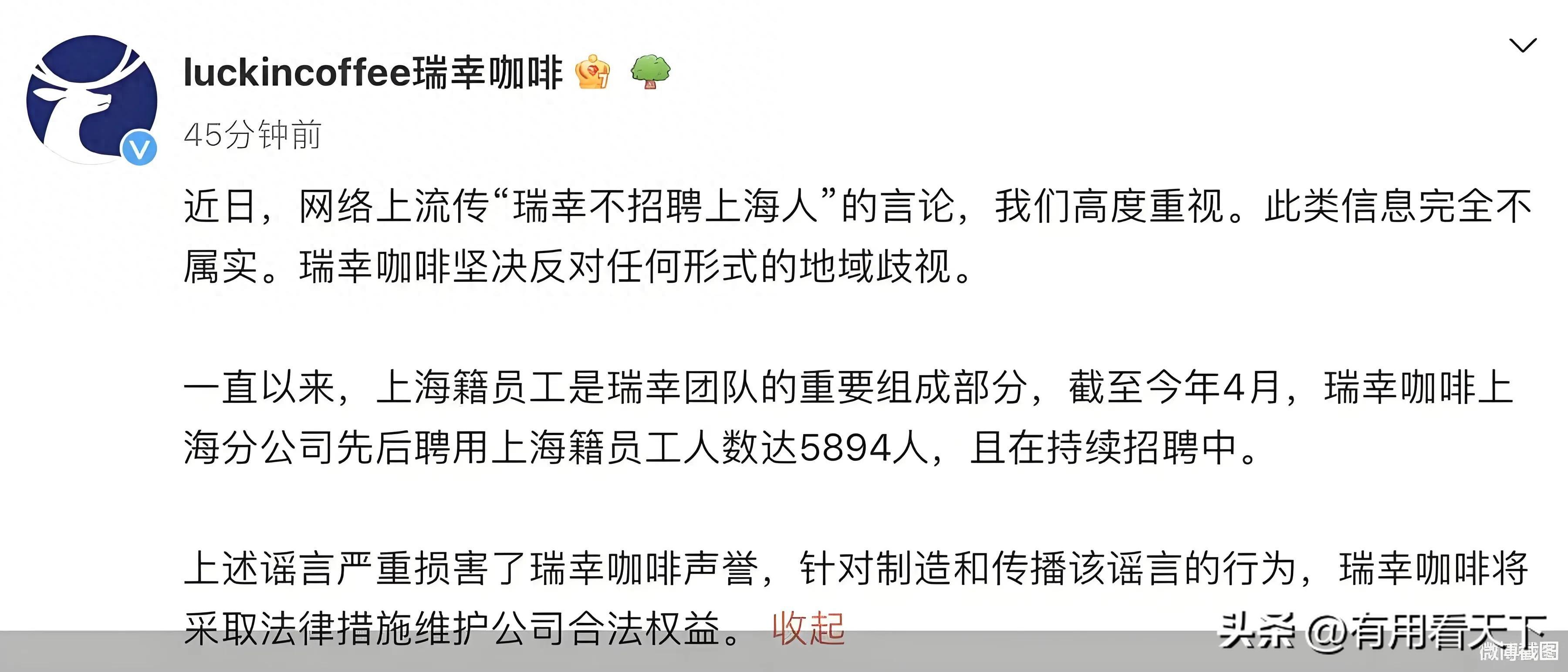 近日,一则关于“瑞幸不招聘上海人”的传闻在网络上迅速传播,引发了社会各界的广泛关注。对此,瑞幸咖啡在官方微博上发表声明,坚决辟谣,并表示将采取法律措施维护公司合法权益。