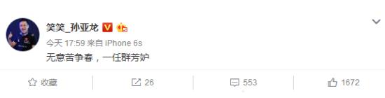 斗鱼TV主播五五开发布那则微博后,西卡也将其翻版后进行回应,而笑笑则表示“无意苦争春,一任群芳妒”,笑笑老婆还转发笑笑这条微博并评论为文艺秃。