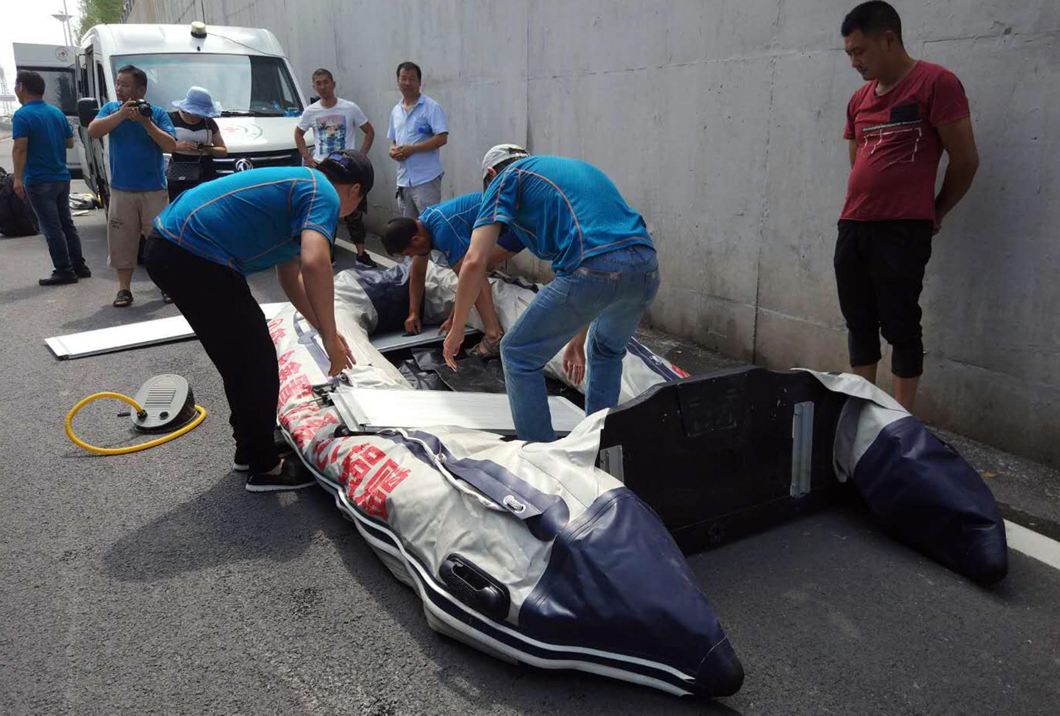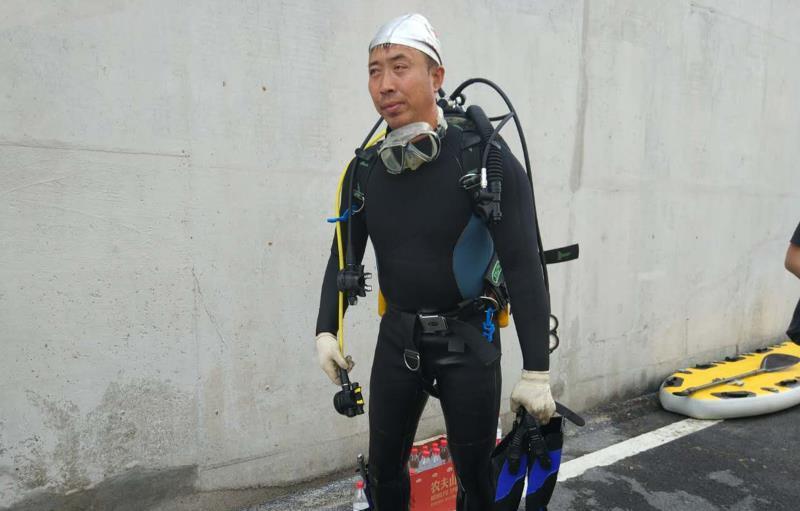 为了从水中拉出被淹没的车辆,司机向郑州市水上救援队求助,救援队动用“蛙人”下潜到三米多深的积水中,将钢缆援绑在大巴车底部慢慢向外拖拽。
