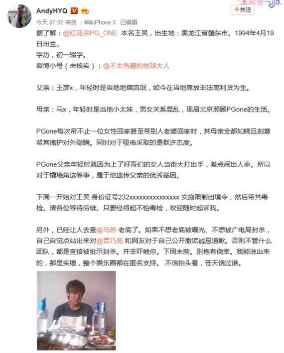 原来PG One的父亲曾是当地的地痞流氓,如今在当地靠放非法高利贷为生,母亲年轻时曾是当地的小太妹,男女关系混乱,现居北京照顾PG One的生活。而且曝光了下周一开始要带PG One毒检。看来PG One这次是在劫难逃了。