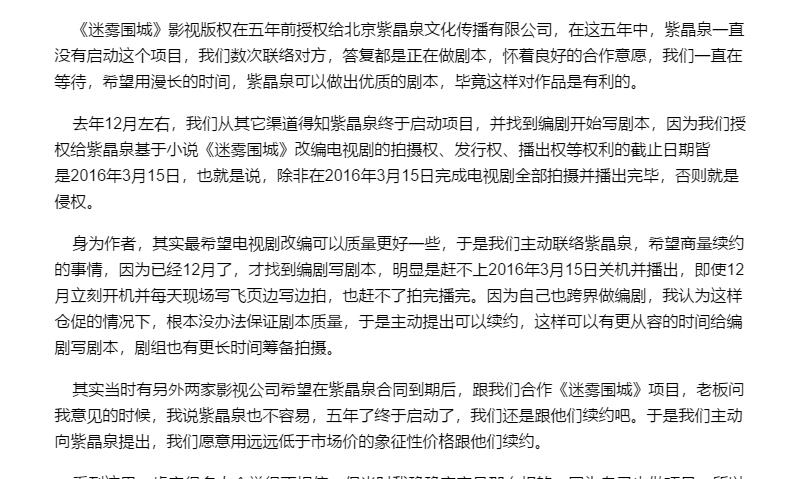 据悉,2016年3月14日,《迷雾围城》(也就是如今的《人生若只如初见》)影视版权授权合同法就已到期,而在3月12日,距合约期结束仅两天之前,该电视剧才开机并改名为《人生若只如初见》,此时,匪我思存提出给予对方两周时间来协商续约,但对方并未予以理睬。4月1日,匪大在微博公开质疑此事,并由代理公司将其诉至法院,对方一边应诉,一边侵权继续拍摄。