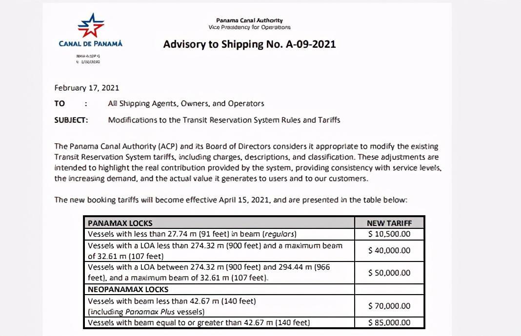 鉴于巴拿马运河管理局日前新的费用收取标准