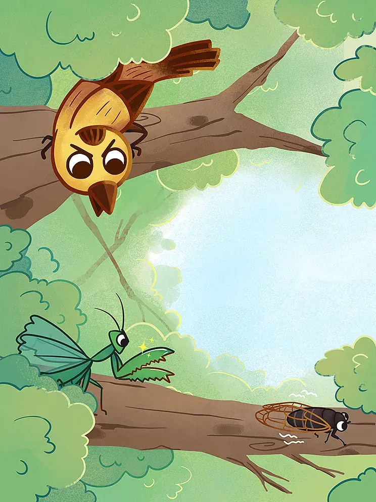 语出汉朝刘向《说苑·正谏》:“园中有树,其上有蝉,蝉高居悲鸣饮露,不知螳螂在其后也;螳螂委身曲附欲取蝉,而不知黄雀在其傍也。”