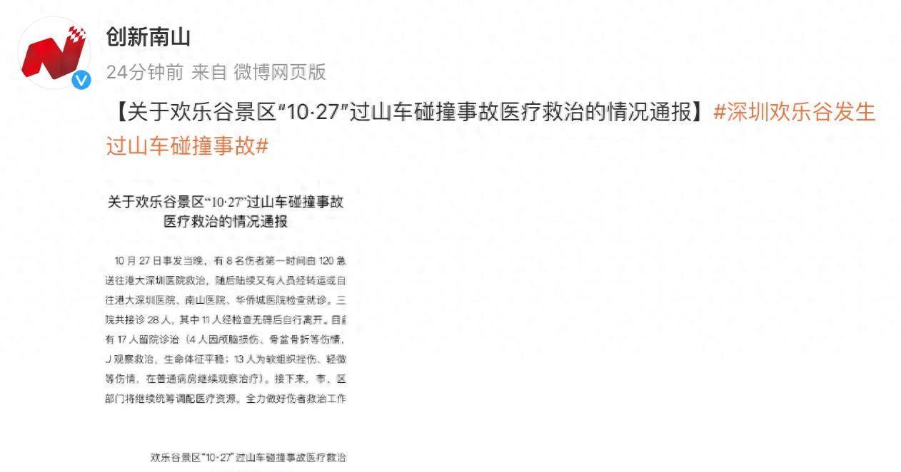 【深圳欢乐谷“10·27”过山车碰撞事故医疗救治情况通报】17人留院,4人ICU救治。事发当晚,8名伤者被送往港大深圳医院救治,共有28人接受检查就诊。目前,共有17人留院诊治,其中4人在ICU观察救治,13人在普通病房继续观察治疗。深圳市、区卫健部门将继续统筹调配医疗资源,全力做好伤者救治工作。事故发生时,一列载有22名游客的过山车与另一列载有24人的过山车发生碰撞,造成部分游客受伤,但两列过山车均未脱轨。相关部门已成立调查组,对事故原因展开调查。想必大家都有去过欢乐谷的经历吧,是不是感觉刺激又好玩?但是,就在10月27日晚上,欢乐谷发生了一起过山车碰撞事故,造成了17人留院,4人ICU救治的情况。这到底是怎么回事呢?我们一起来了解一下吧。事发当晚,8名伤者被紧急送往港大深圳医院进行救治,而随后,还有更多的人员前往港大深圳医院、南山医院、华侨城医院检查就诊。