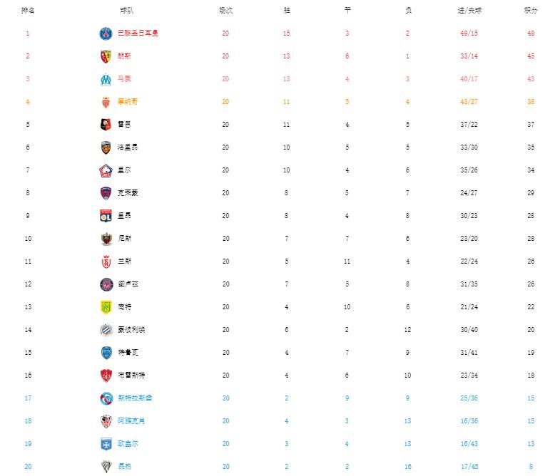 1月30日,法甲第20轮落下帷幕,本轮大巴黎被兰斯绝平,1-1战平对手之后领先优势缩水。洛里昂、图卢兹都取得了胜利,焦点战马赛和摩纳哥的对决战成平手。接下来我们一起来看看法甲最新排名: