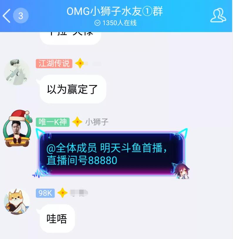今天,似乎已经有人向大家公布这个答案。OMG小狮子刚刚在个人的粉丝群里宣布即将于明日正式在斗鱼开播了,这个消息似乎也就解释的通,为何斗鱼之前会卖力宣传其他平台的主播了。