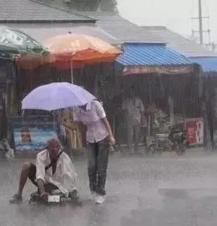 因腿部残疾只能靠乞讨为生的老大爷来不及避雨,只能望雨兴叹。突然,老人的头上多了一把雨伞。老人疑惑着抬起头,却看到了一位美丽的姑娘,雨伞已经完全偏向于老人,自己上衣、牛仔裤、运动鞋却完全湿透。