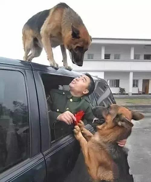战士退伍,他一直训练的警犬“待发”和“大海”一直拉扯他的行李,不让他走。好容易坐上车了,“待发”突然蹿上车顶,“大海”扑车窗狂叫,车只好停下来,连司机都哭了。