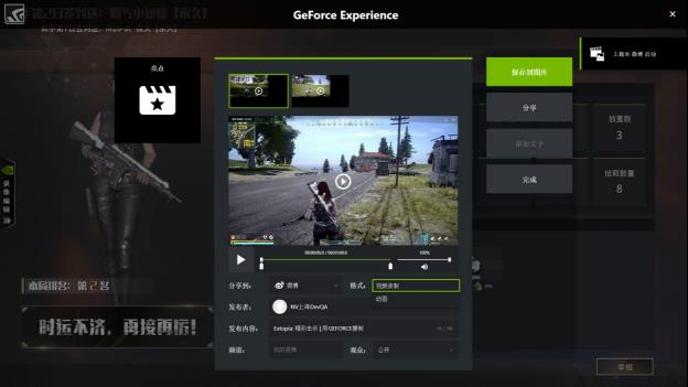 《自由禁区》还支持NVIDIA Highlights技术,在游戏过程中能够自动识别对战的精彩时刻,并录制成高质量的短视频,且支持一键分享到微博。要打开英伟达Highlights功能,只需在游戏的设置中找到录像设置,并设为“NVIDIA Highlights”即可。选项设置完毕后,进入游戏时GeForce Experience会弹出提示,是否为《自由禁区》开启Highlights,点击“是”即可。