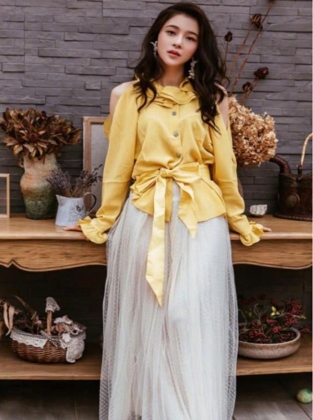赵韩樱子的这身搭配也不错。姜黄色的露肩上衣,衣服胸前采用一排扣子,领口处还配有波浪式的几层装饰,还能系带来凸显腰身的纤细。下身搭配的是一条白色半身裙,裙子上拼接了透视的纱网,这样设计显得裙子更加的清新自然。