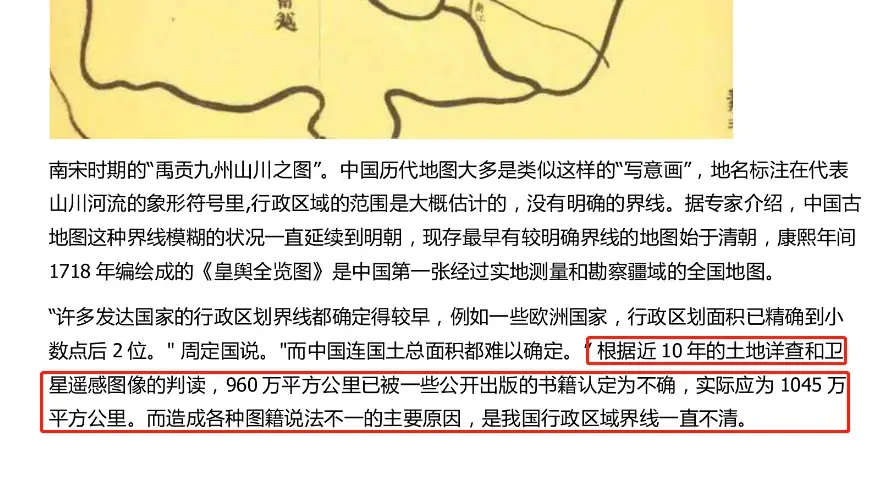 文中还提到,中国各个省、自治区和直辖市的面积相加并不等于960万平方公里。“根据最近10年的土地详细查询和卫星遥感图像的判断,实际为1045万平方公里。”