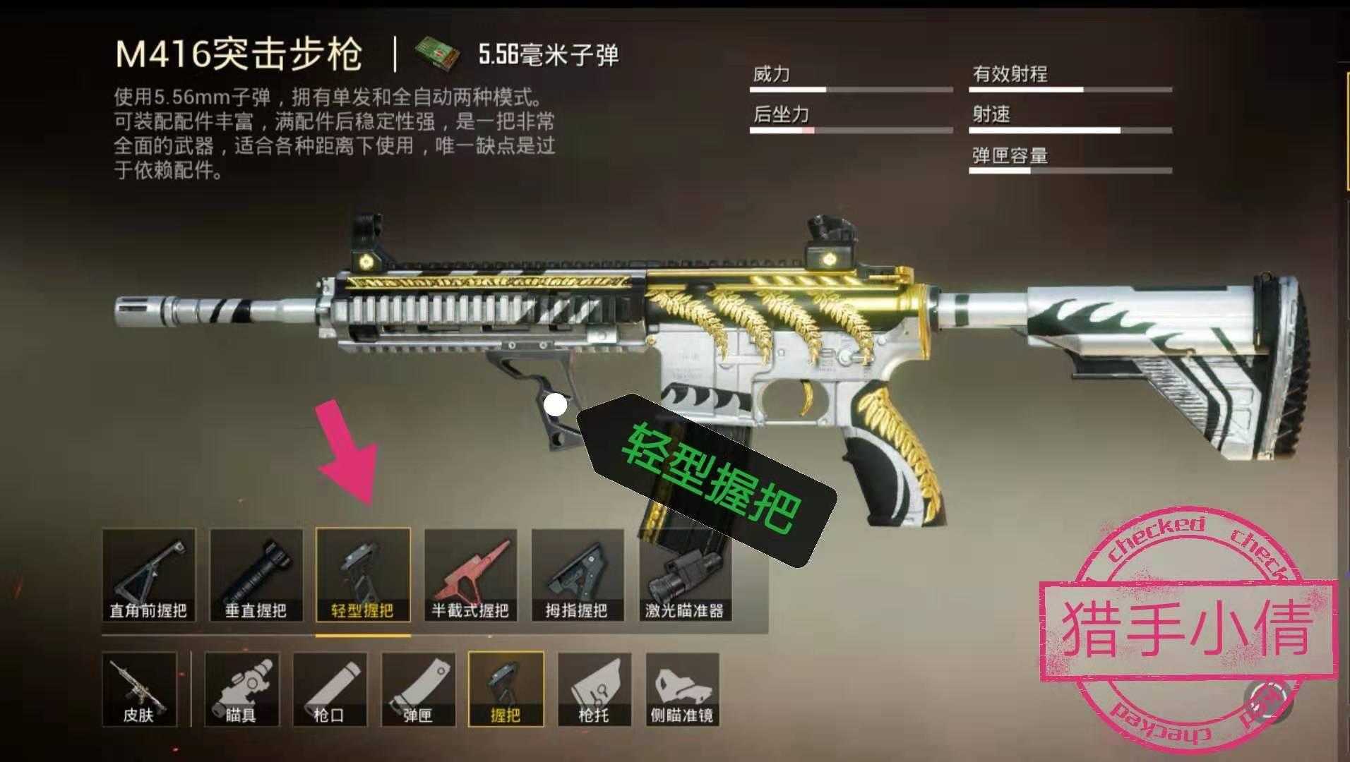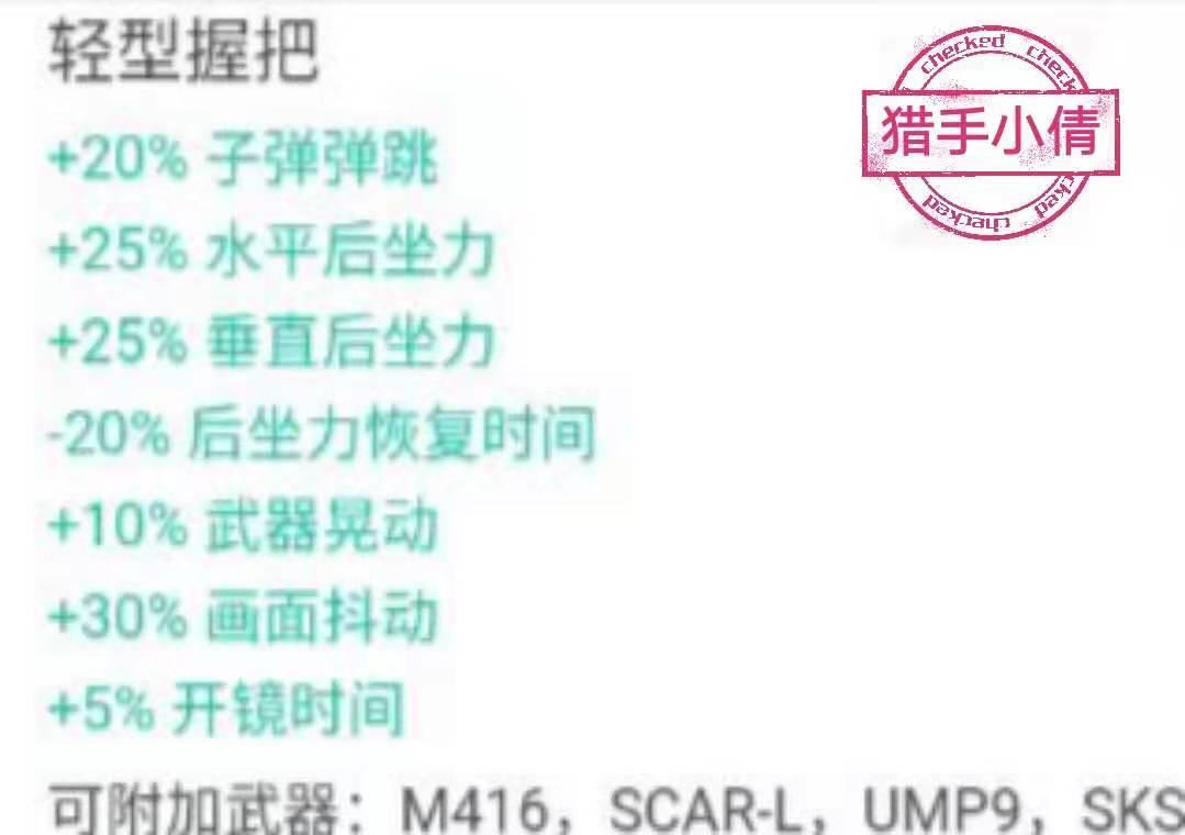 轻型握把这款配件可大幅度提升射击的稳定性,可减少后坐力回复时间,在开火过程中减少枪支的晃动幅度。