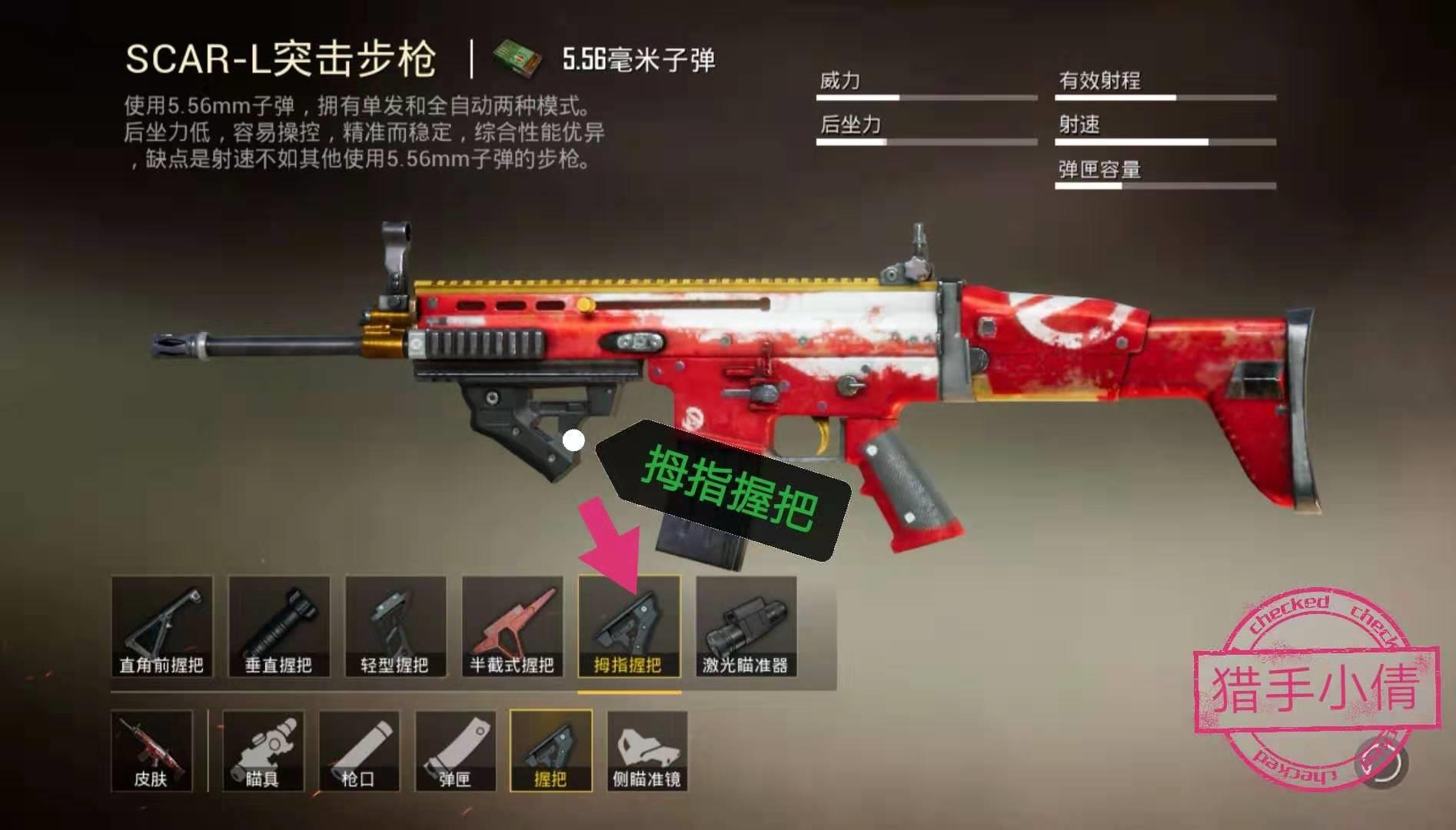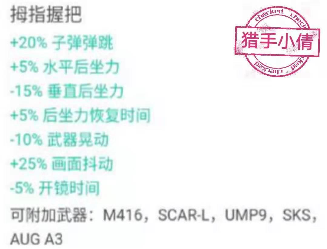说到拇指握把,他可以提升射击的稳定性,偏移幅度比较小,开镜速度也比较快。