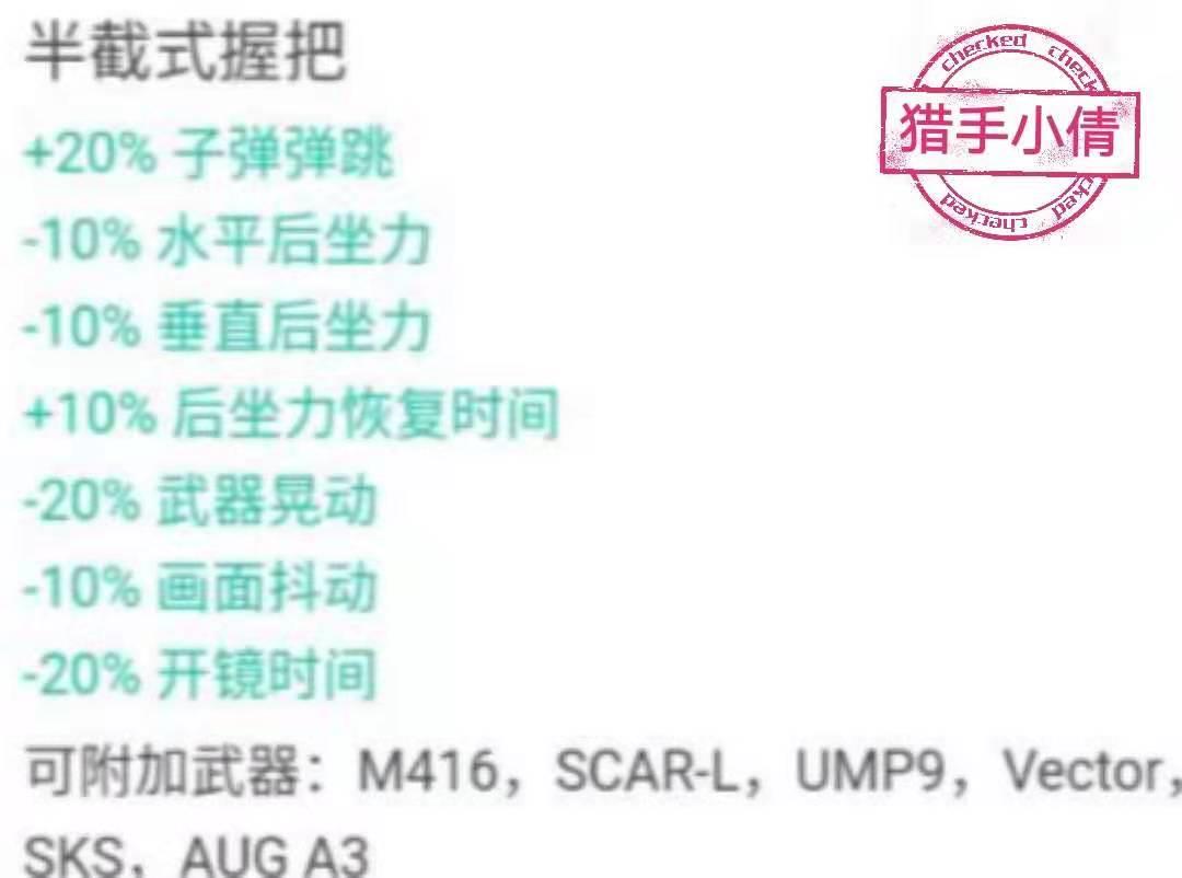 半截式握把是这五种握把中性能比较强的一款,这款握把在开火过程中上下抖动的比较好点,射出的子弹比较集中,操作轻松,压抢时比较固定。