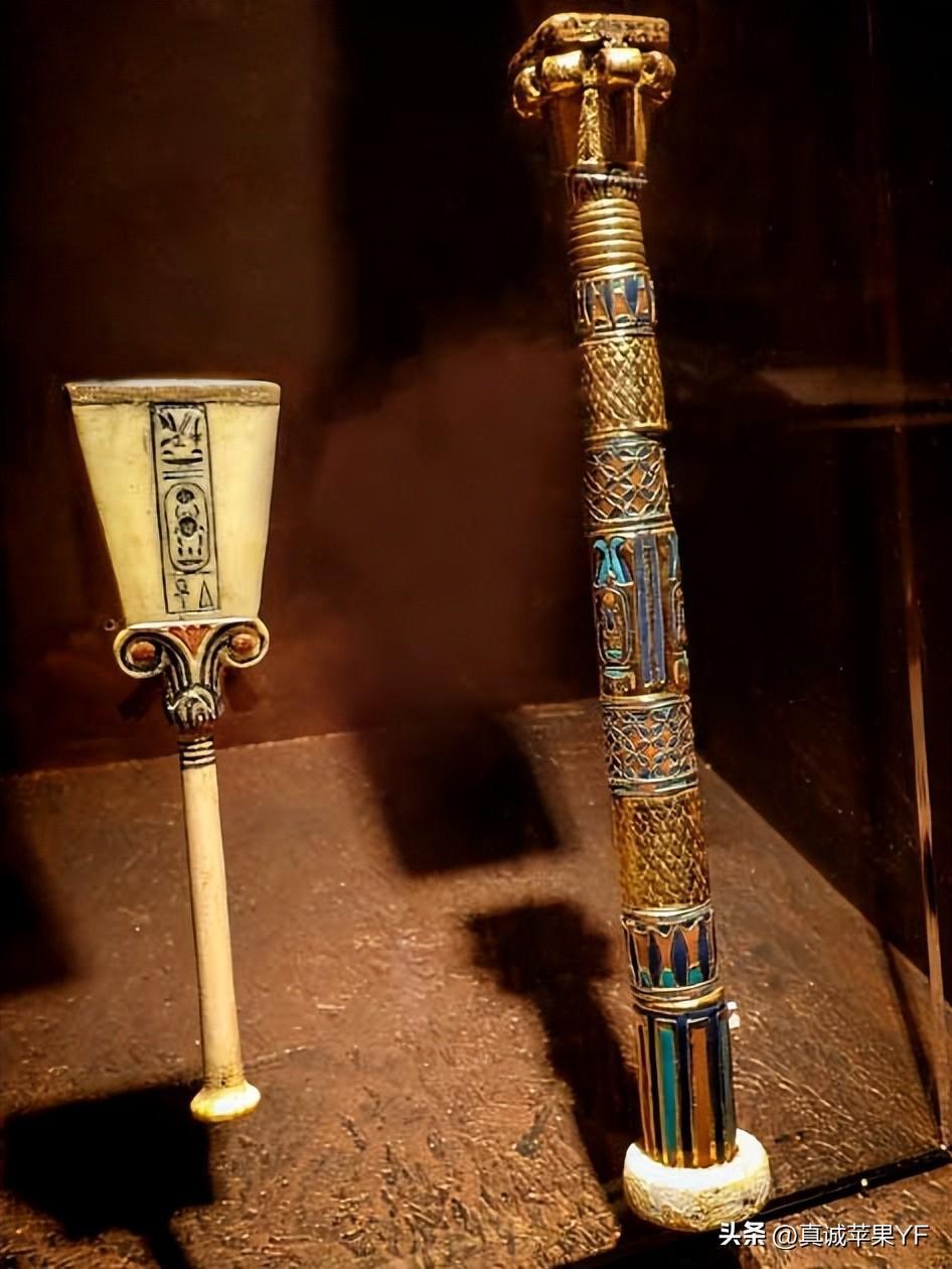 在图坦卡蒙墓中发现的象牙拨浪鼓和华丽的芦苇笔盒