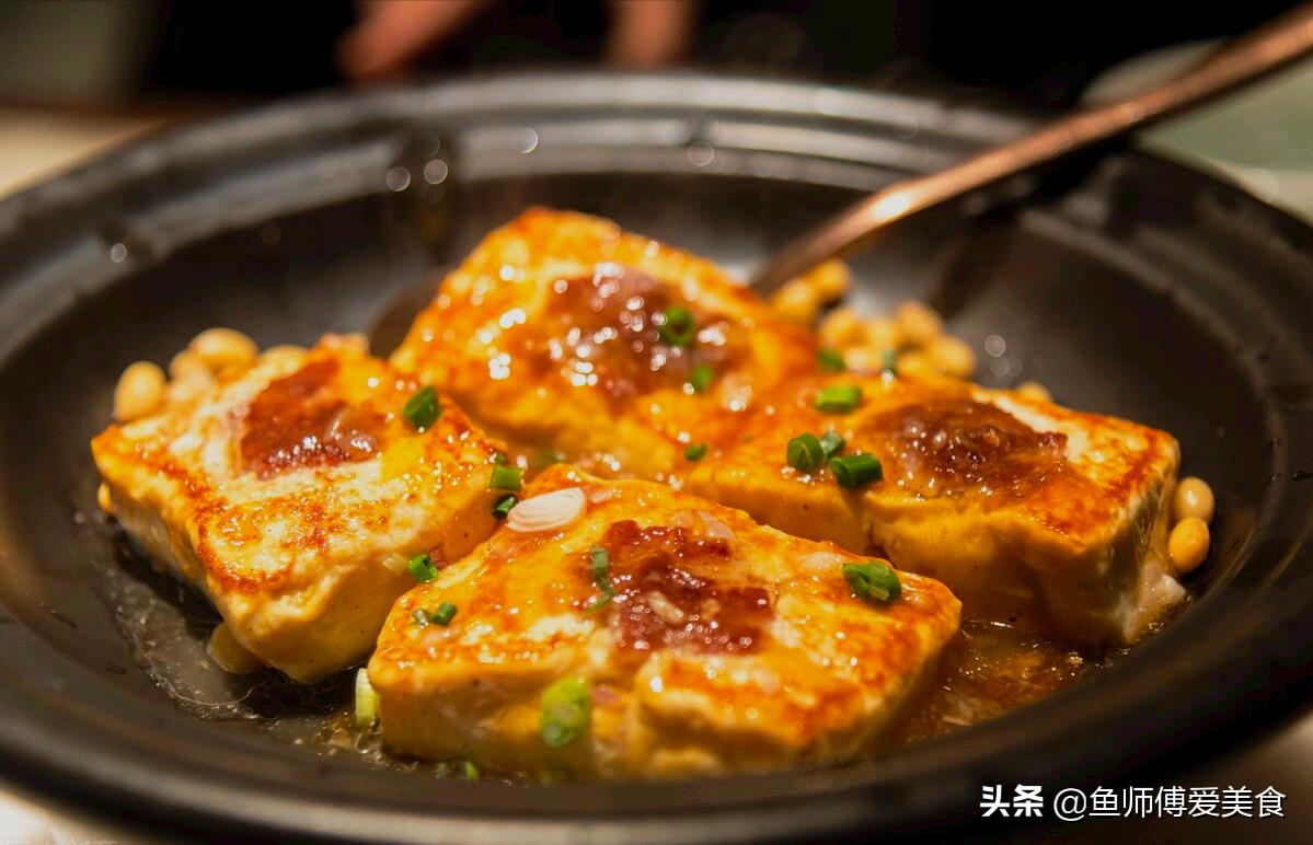 6.平底锅放少许食用油,把豆腐两面煎成金黄色,有肉馅的一面多煎一会。
