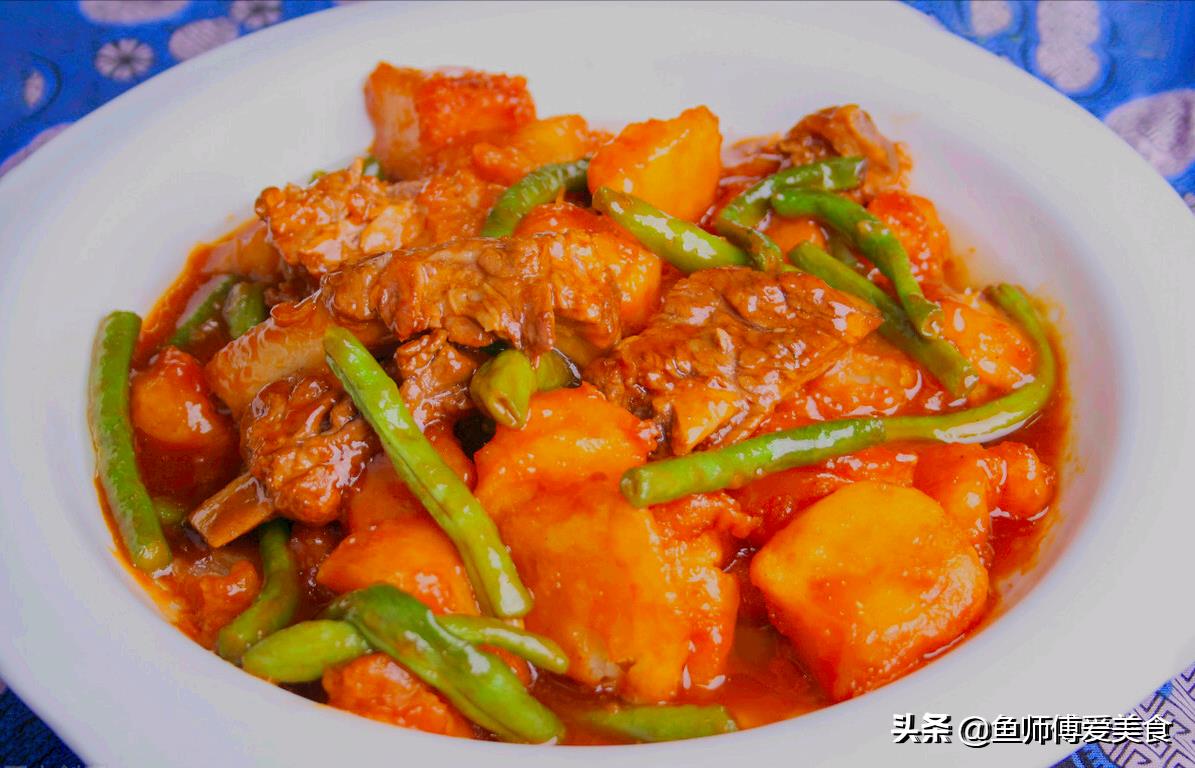 【食材】土豆2只,长豆角少许,猪肋排500克。葱姜蒜,八角各少许。