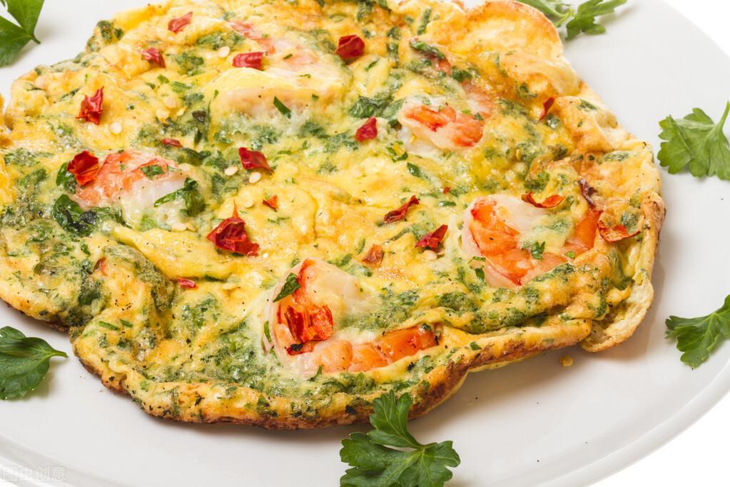 4.把虾仁,菠菜倒入鸡蛋液中,摊平后,把鸡蛋翻过来,继续煎2分钟即可。