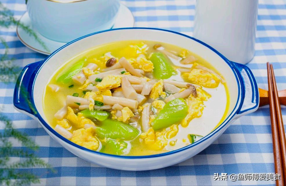 【食材】丝瓜1条,蟹味菇100克,鸡蛋3只,葱姜各少许。