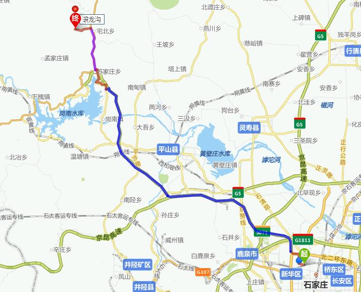 自驾路线:石家庄——西柏坡高速(岗南下)——S202——G207——滚龙沟。全程约80公里,自驾2小时。