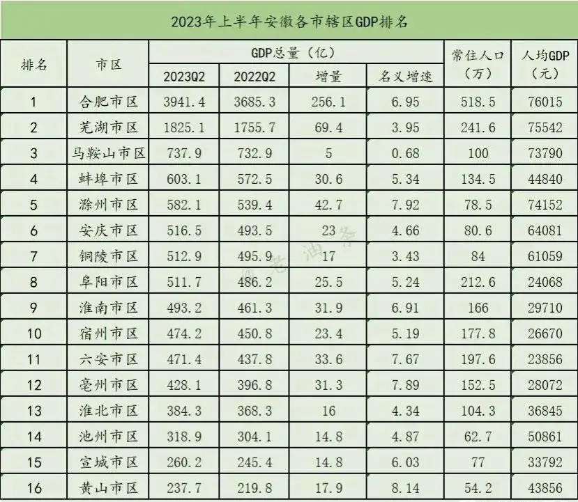 安徽各城市市区GDP排名 芜湖稳居第二 滁州仅排第五 蚌埠让人意外