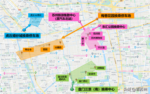 虎丘婚纱城换乘停车场-虎阜路-海涌山路-苏城大道(虎丘北门)。