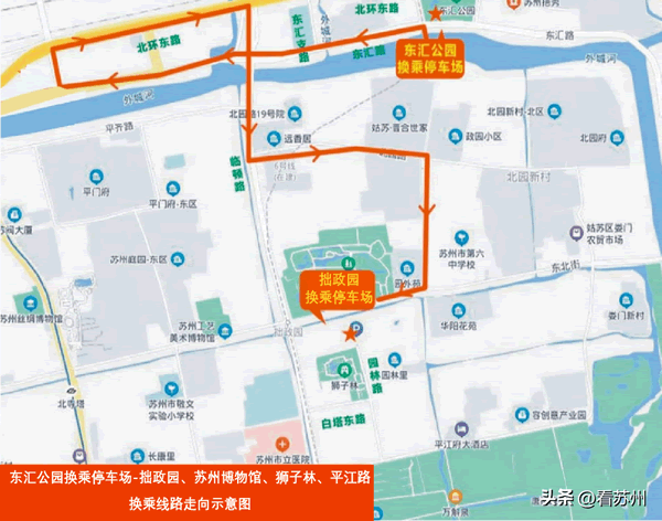 东汇公园换乘停车场-东汇路-西汇路-西汇支路-北环东路-齐门路-北园路-百家巷-东北街-拙政园换乘停车场。