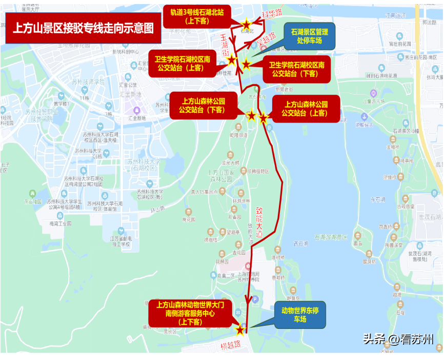 轨道3号线石湖北站-科华路-玉湖街(石湖景区管理处停车场停车泊位300左右)-致能大道-上方山森林动物世界(动物世界东停车场停车泊位700左右)-致能大道-玉湖街-吴越路-科华路-轨道3号线石湖北站。