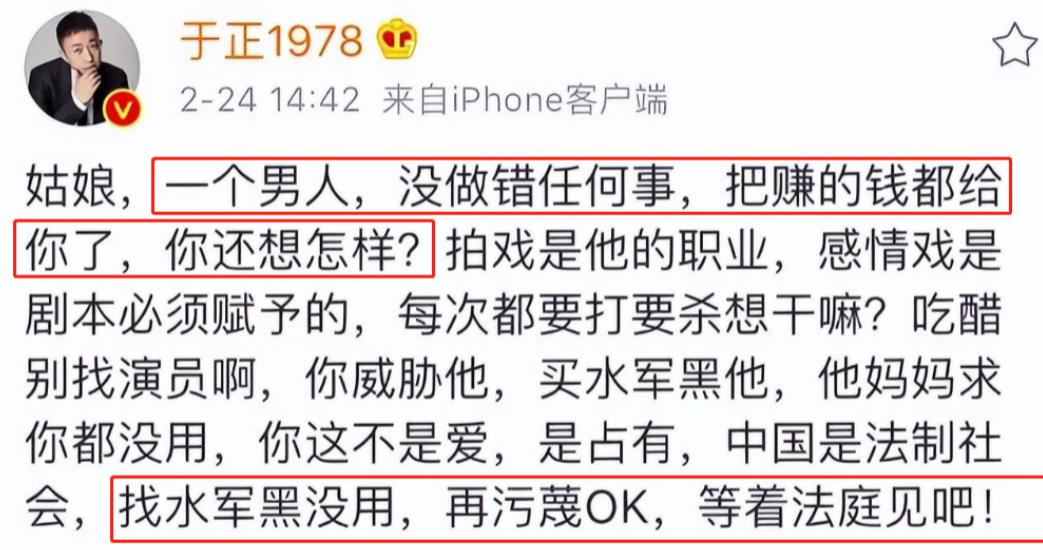 因此于正才会将这件事在公众平台发出来。以免东窗事发的时候,被人污蔑,想要抢先一步为自家艺人维护清白。于正对于这件事非常的愤怒,一段时间后再一次在社交平台上发布了为赵弈钦声援的短文。在这篇短文中不断的炮轰赵弈钦前女友,表示手下的艺人并没有做出什么坏事。表示会用法律途径来抵制女孩的“恶毒行为”。