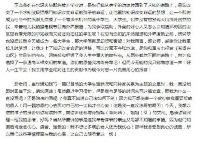 在"感谢信"中向海清表示,自己不知该如何下笔去指责一个曾经帮助过他的恩人,并且还详细地说到了孙俪对她资助的全过程。