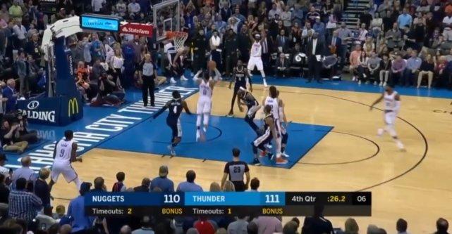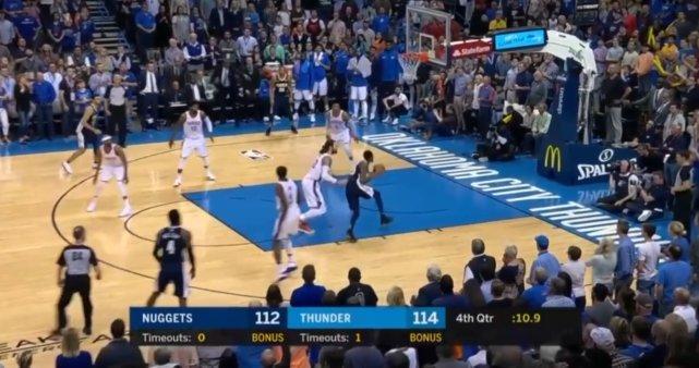 巴顿在三分外线持球,而对雷霆队亚当斯的贴身防守,以一次完美的背后运球,外加一个华丽的转身,过掉亚当斯直接挑篮得分。