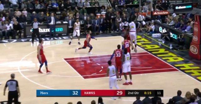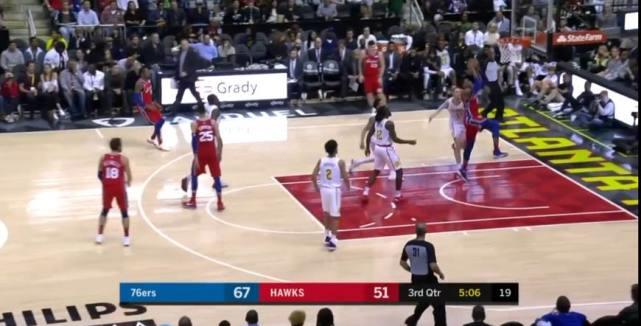 西蒙斯在三分弧顶,一招声东击西,将球传到正在切入内线的霍姆斯,后者接到球后,随即跃起就是一记暴扣得分。