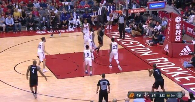 哈登在三分线外运球直冲内线,在罚球线附近时突然急停,把对方防守球员防倒在地后变向运球,直冲内线,面框左手上篮得分。