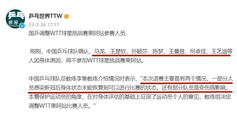 但是要知道就在本次比赛开打之前,根据WTT官网发布的消息显示,国乒调整了本次球星挑战赛的参赛名单,其中有7位球员正式退赛本次比赛,而在这7位球员中有6个人都算是国乒男女队的核心主力球员,这对于国乒本次比赛来说影响巨大,但是为了保险起见,为了更好的身体状态备战大满贯的比赛,所以说退出本次球星挑战赛也是无奈之举。