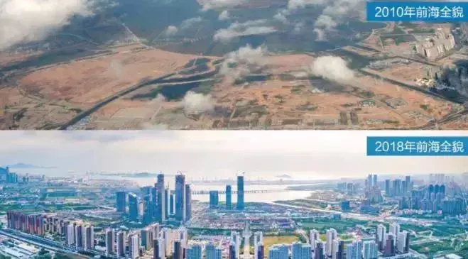 在深圳前海石公园的前海开发开放成果展示墙上,这张八年间的对比图异常醒目。央视记者 谢晓光 摄