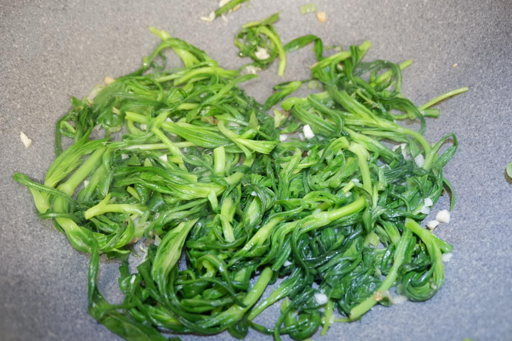 下入野菠菜,加入少许盐,把野菠菜炒至出水变软。
