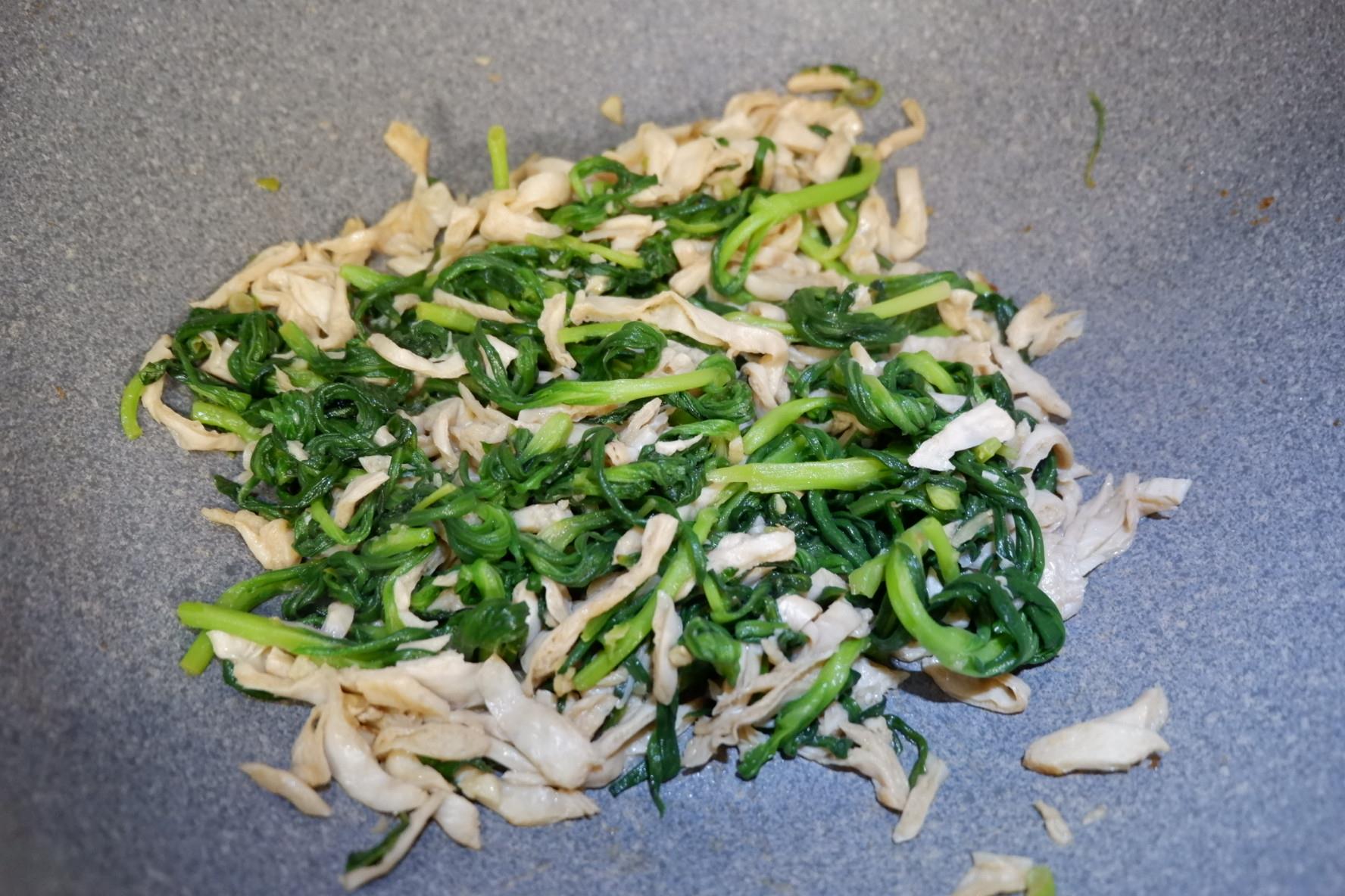 加入素肉丝,调入蚝油、生抽和鸡精,翻炒均匀即可出锅。
