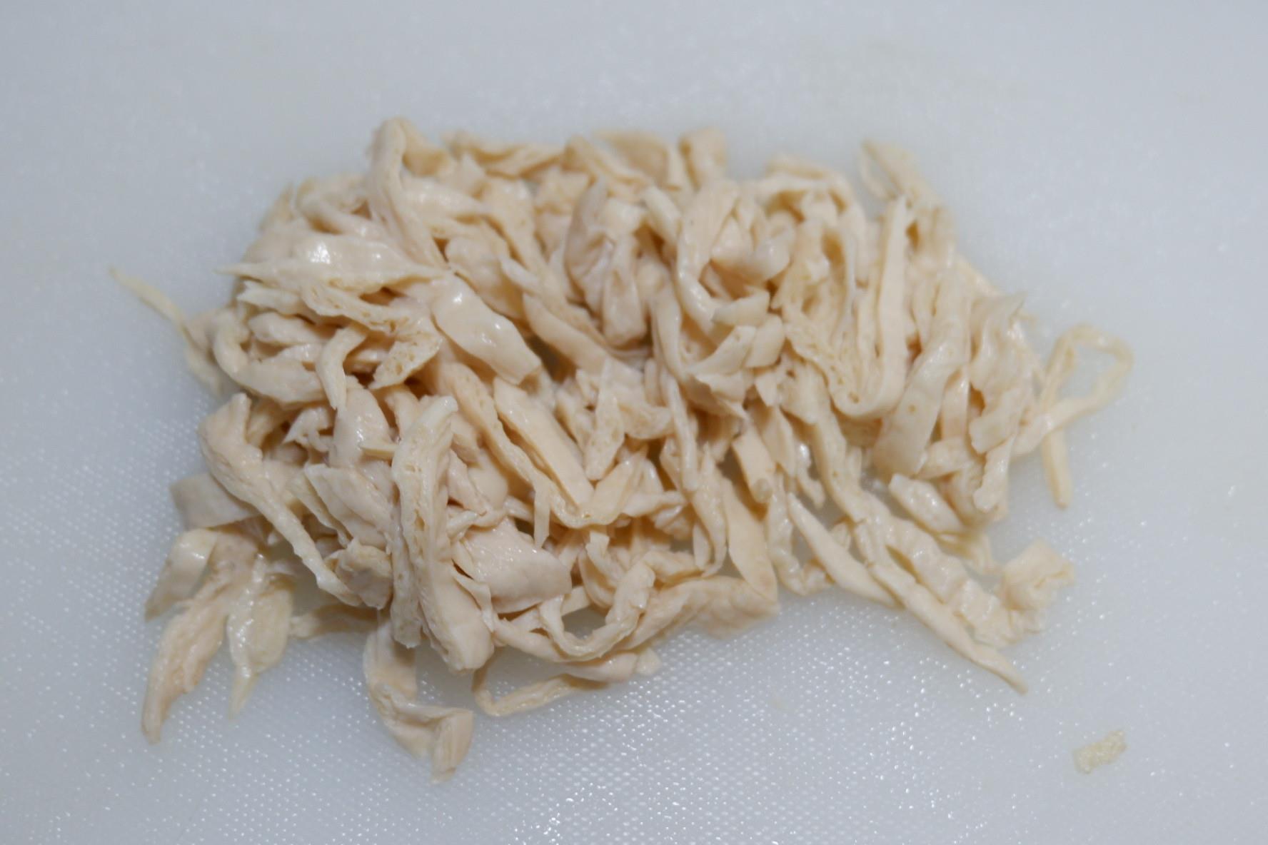 蛋白素肉用温水泡发,锅里烧开水,把泡发的素肉丝焯烫片刻。取出来沥干水分,切成细丝。