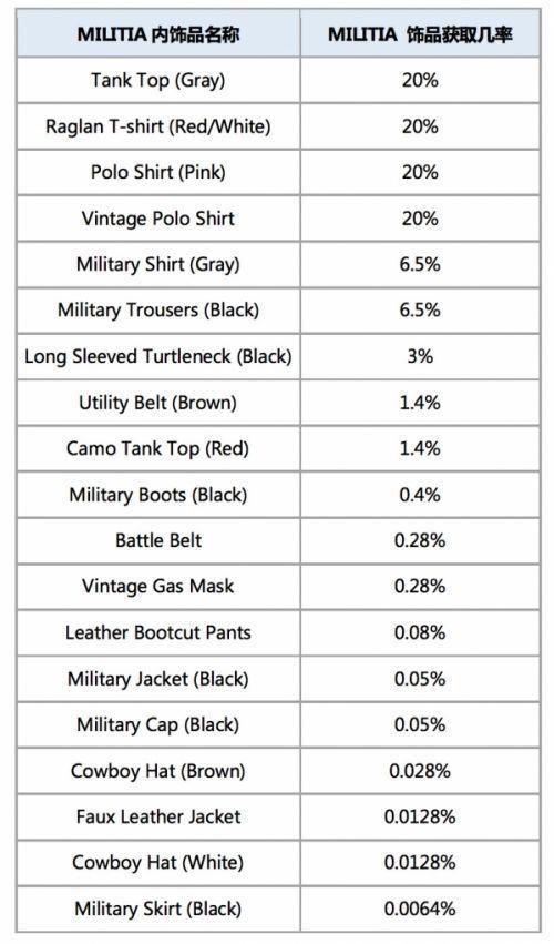 - 新免费箱子MILITIA的获得几率为40%,现有箱子的获得概率如下