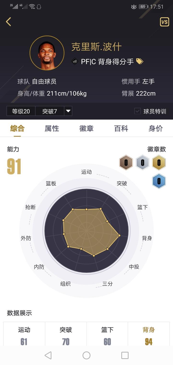 模型上211标准大前,臂展还可以,有内线和两个三分,两个中投热区;原地上篮数值不错,中投三分羁绊后将近100,投篮包也舒服,容易掌握;防守篮板还可以,盖帽及干扰投篮能力平庸;扣篮一般中的一般,篮下有人别乱起;速度66,跟传统中锋比不慢,可下快攻;弹跳中等;进攻稳定性顶级水平。没有徽章
