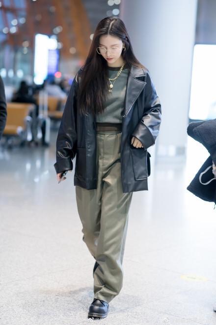 皮衣这种拽酷的单品宋妍霏怎么会错过呢?这件皮衣是宽大的oversize风,但是对于身高接近170的宋妍霏驾驭大欧式什么男士,内搭一件纯色打底,搭配一条垂坠感很高的西装裤,酷女孩装扮就完成啦~