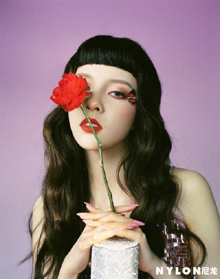 这张头部特写妆容真的蛮欧美,鼻影和高光都打得蛮重,最夸张的还是这个大头儿子刘海,好在CC的脸够长够瘦,不然真的很土,一朵娇艳的玫瑰遮住右眼,一直蝴蝶附在左眼上面,眼神迷离。