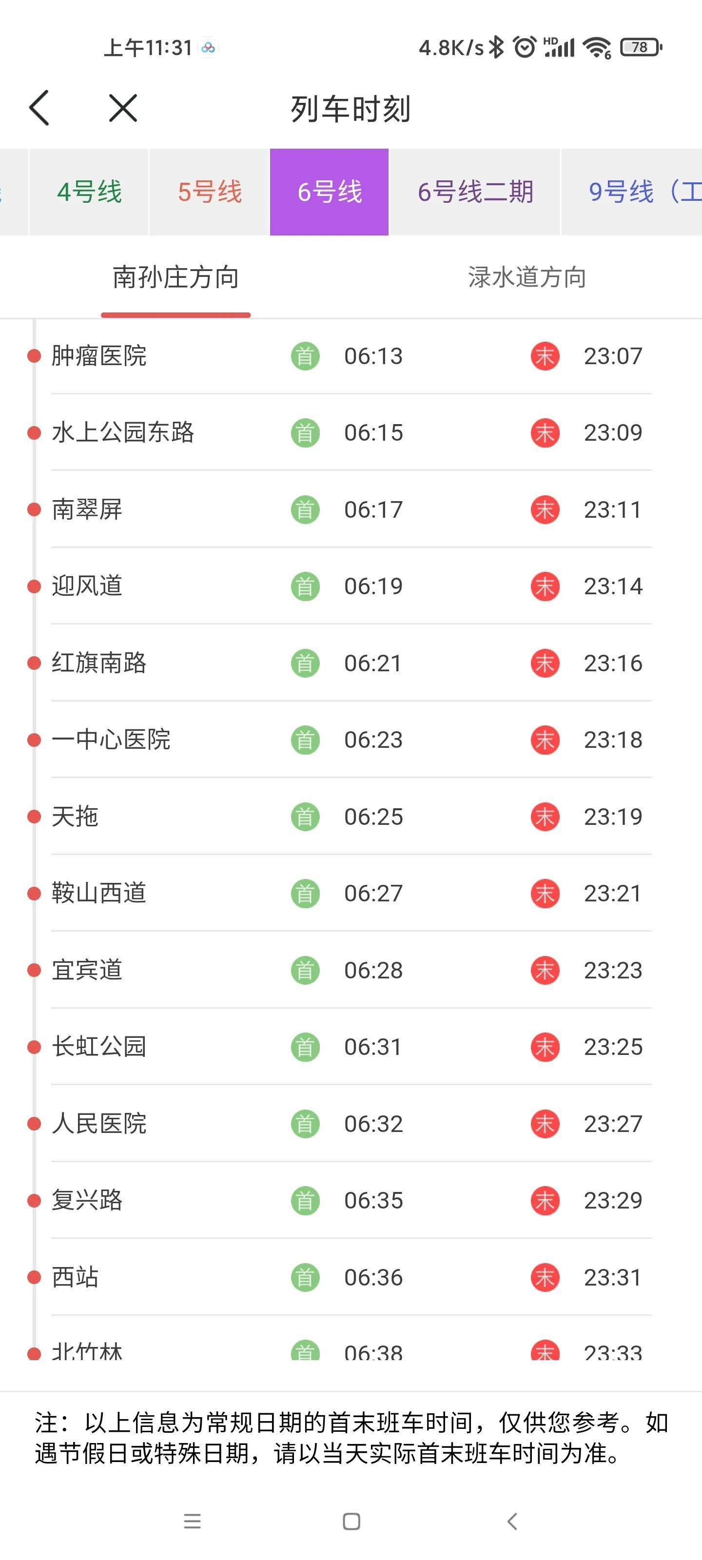 6号线首末班车时刻: