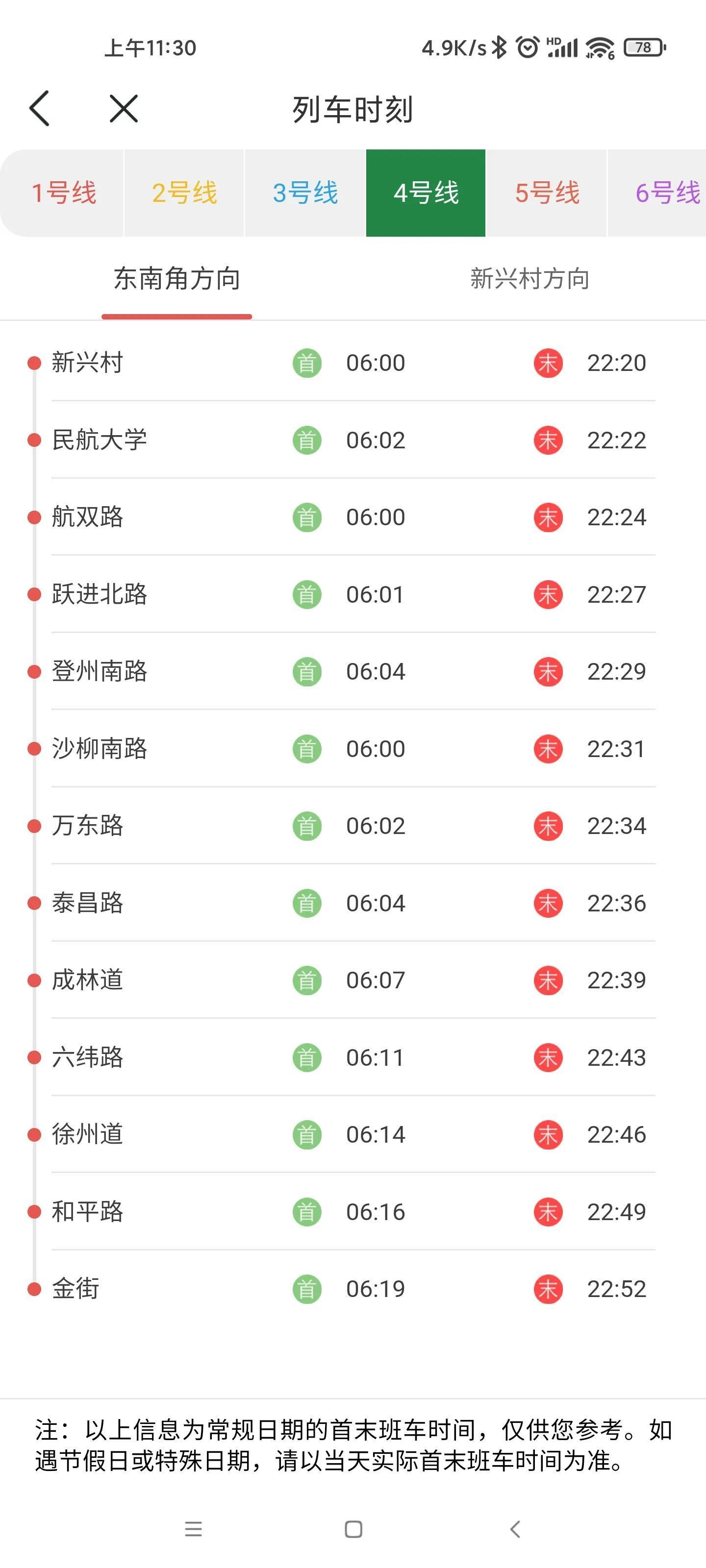 4号线首末班车时刻: