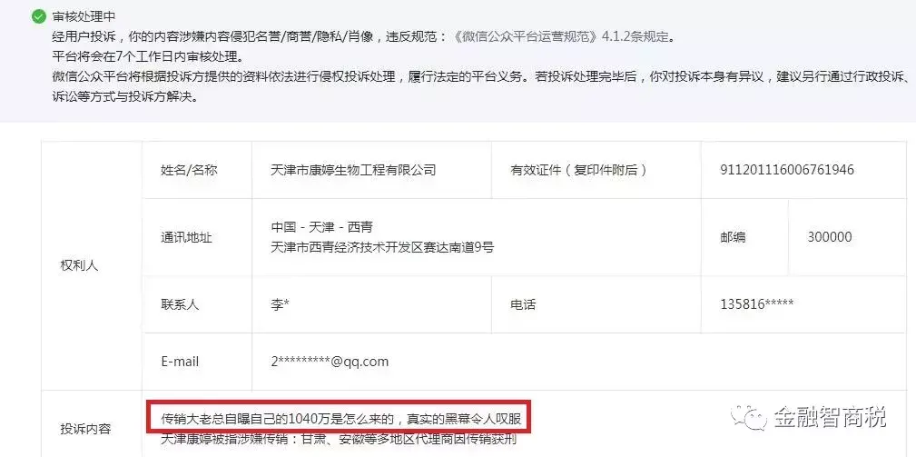 值得注意的是,5月15日,金融智商税转发南明政法发布的《传销大老总自曝自己的1040万是怎么来的,真实的黑幕令人叹服》的文章也遭到天津康婷公司的投诉。该文是警方在破获“1040阳光工程”传销案时,抓获的一名传销大老总揭露“1040阳光工程”真实黑幕的文章。