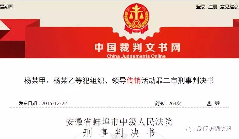 2015年11月30日,蚌埠市中级人民法院以组织、领导传销活动罪,分别判处杨某、李某、晁某、余某等十人缓刑四年到缓刑三年不等的有期徒刑,并处罚金三十万元到五万元不等。